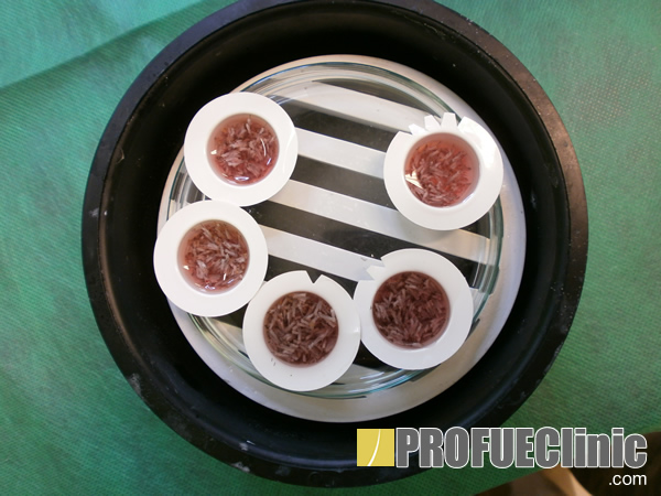 A beavatkozás első része a FUE hajvétel, vagyis a follikuláris egységek, graftok sérülésmentes kinyerése, ami általában 4-5 órát vesz igénybe. A művelethez speciális körtűt alkalmazunk, mely igazodik az adott hajtüszők méretéhez. A hajvétel második szakasza a körbemetszett hajtüszők kihúzása. Ezek, kinyerésük után azonnal egy speciális, hűtött tápoldatba kerülnek, mert ezek a szövetdarabok, hajhagymák rendkívül érzékenyek a kiszáradásra.A kinyert graftokat hajszáltartalmuk alapján rendszerezzük és megszámoljuk. Ez azért szükséges, hogy a haj átültetésének végén pontosan tudjuk, hogy hány hajtüsző egység, illetve hajszál került átültetésre.